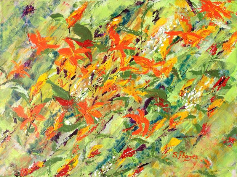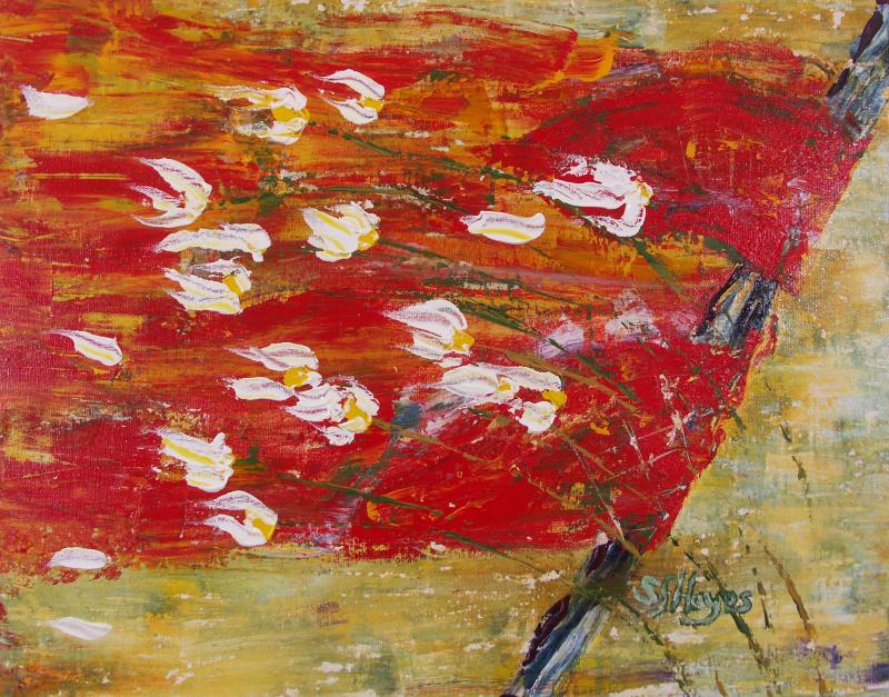 An abstract work of vibrant colors and movement, this work representing flowers in a field being blown by the wind is quite moving to me. I have studied it for hours and still find intrigue. Acrylic on canvas, unframed, 18" x 24" Prints are available.