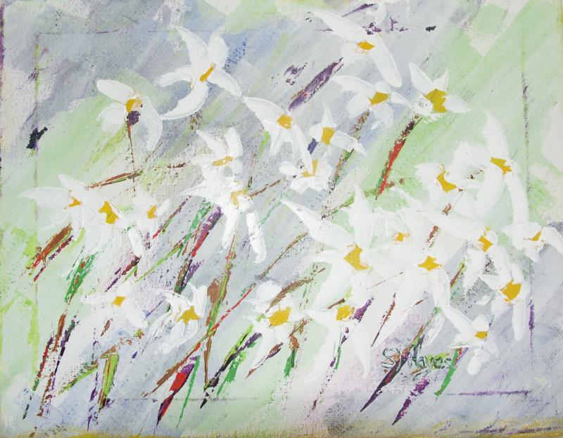 An abstract that many folks describe as a field of daisies in front of a blowing flag. I just like the colors and motion in the painting. Acrylic on canvas, unframed, 14" x 18"