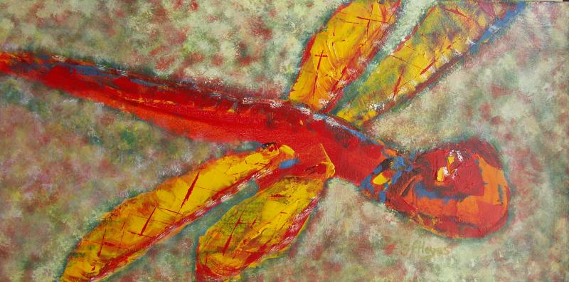 Multi-colored and layered, this painting was created to capture the imagination regarding "transformation" as it is represented in the dragon fly. Acrylic on canvas, unframed, 12" x 24".