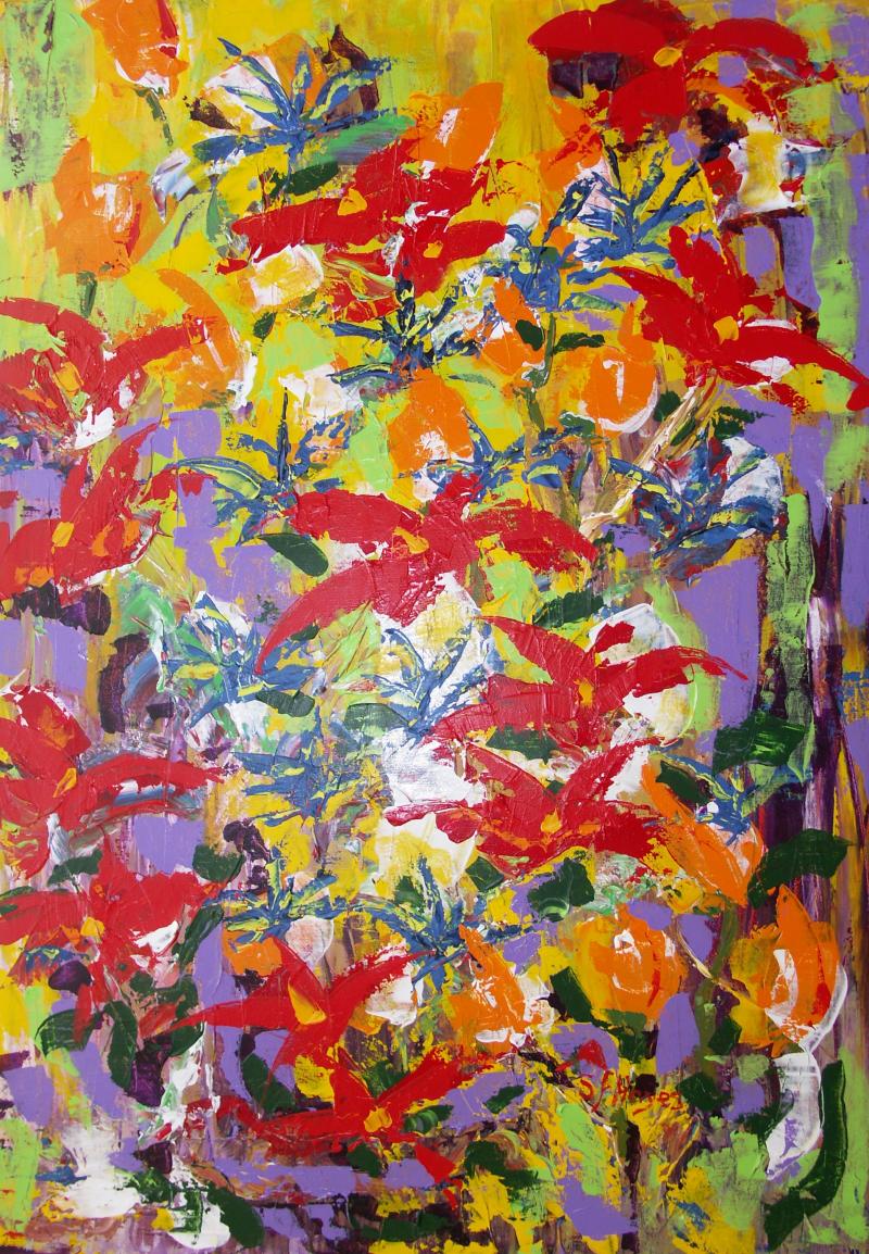 I love the feeling of these large colorful canvases of flowers. This one is filled with little surprises and would brighten any room or wall. Acrylic on canvas, unframed, 20" x 28"