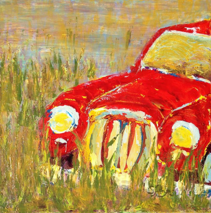 I love this painting of an old car in a field being reclaimed by the grass. The lavender hue that tints this painting adds an antique feeling to the whimsicle image. Acrylic on canvas, framed in black floater frame, 24" x 24"