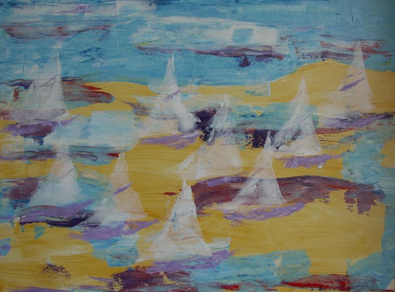As light and airy as a day on the bay, this painting is just the thing you need if you want to imagine being on the ocean and under sail. Acrylic on canvas, framed, 18" x 24" This piece has been selected to be shown in the Maine College of Art Create II show in Fall 2013.